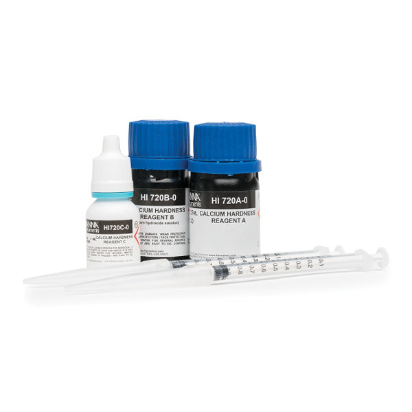 The HI-720-25 are high-quality reagents that are pre-measured, allowing for users to achieve fast and accurate measurements with their Calcium Hardness Checker® HC. These reagents follow the Calmagite method in which the reaction between calcium and the reagent causes a violet tint in the sample. When the HI-720-25 reagents are added to the sample, the reaction will take place and the HI-720 will determine the concentration from the colour that is produced. The results will be displayed in ppm of calcium hardness as CaCO3. These reagents are designed to be used with samples that have an expected range of 0.00 to 2.70 ppm CaCO3.