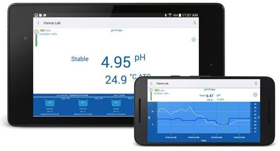 Hanna Lab-appen förvandlar en iPad® till en fullfjädrad pH-mätare när den används med Hanna HALO® pH-elektrod med Bluetooth® smart teknik. Funktionerna inkluderar kalibrering, mätning, dataloggning, grafritning och datadelning. Mätning och loggning av pH och temperatur med en sekunds intervall startar så snart sonden är ansluten. Mätningar kan visas ensamma på displayen, med tabelldata eller som ett diagram. Diagrammet kan planeras och zoomas med iPadens nyp-för-att-zooma-teknik för förbättrad visning.